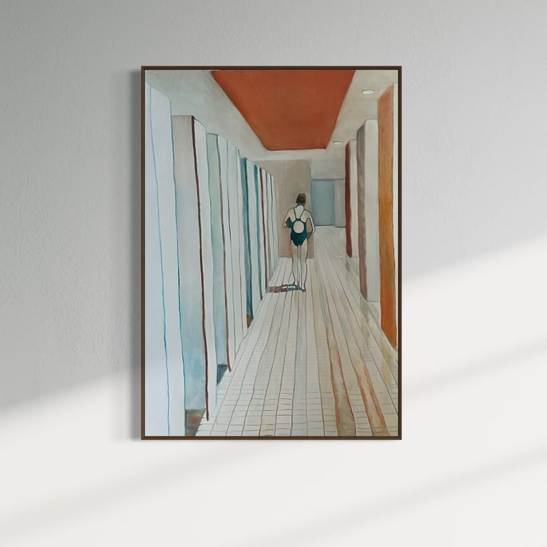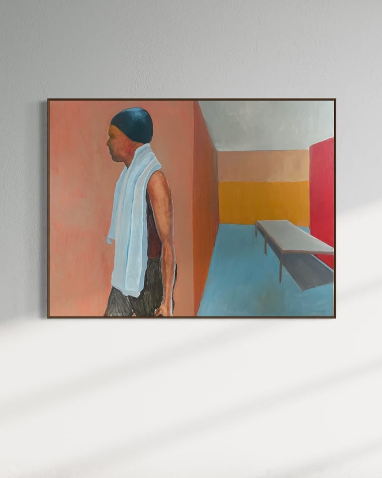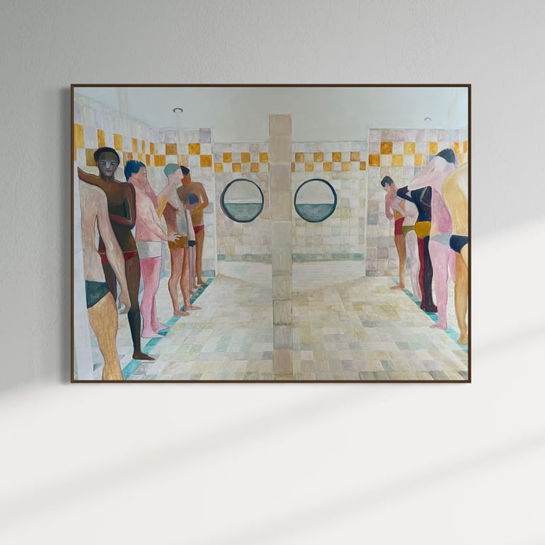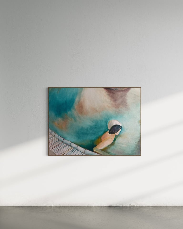 Imaggine yourself, floating in the water of public pools, surrounded by strangers with whom you share changing rooms, shower stalls, and swimming lanes. This series of works was born as a metaphor, where the interiors of the pools becomethe backdrop, while the faces of those who,like you,strive to stay afloat, take center stage in the composition